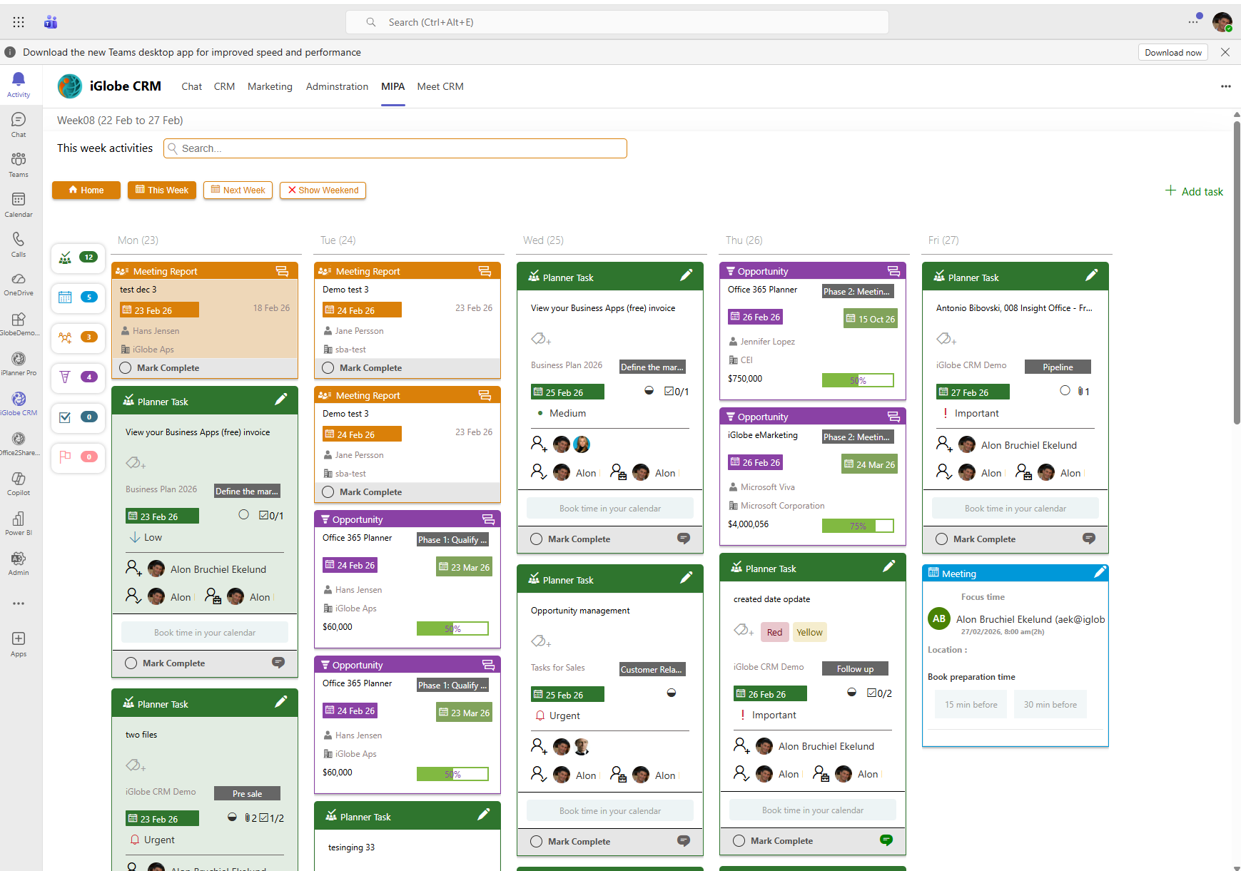 is designed to let users perform some specific actions and tasks with a single mouse-click from this interface. For example, create a note, work with your pipeline, follow-ups, todays calendar, your favourites. The CRM dashboard wall provides real-time business event snapshots of all activities in the CRM.