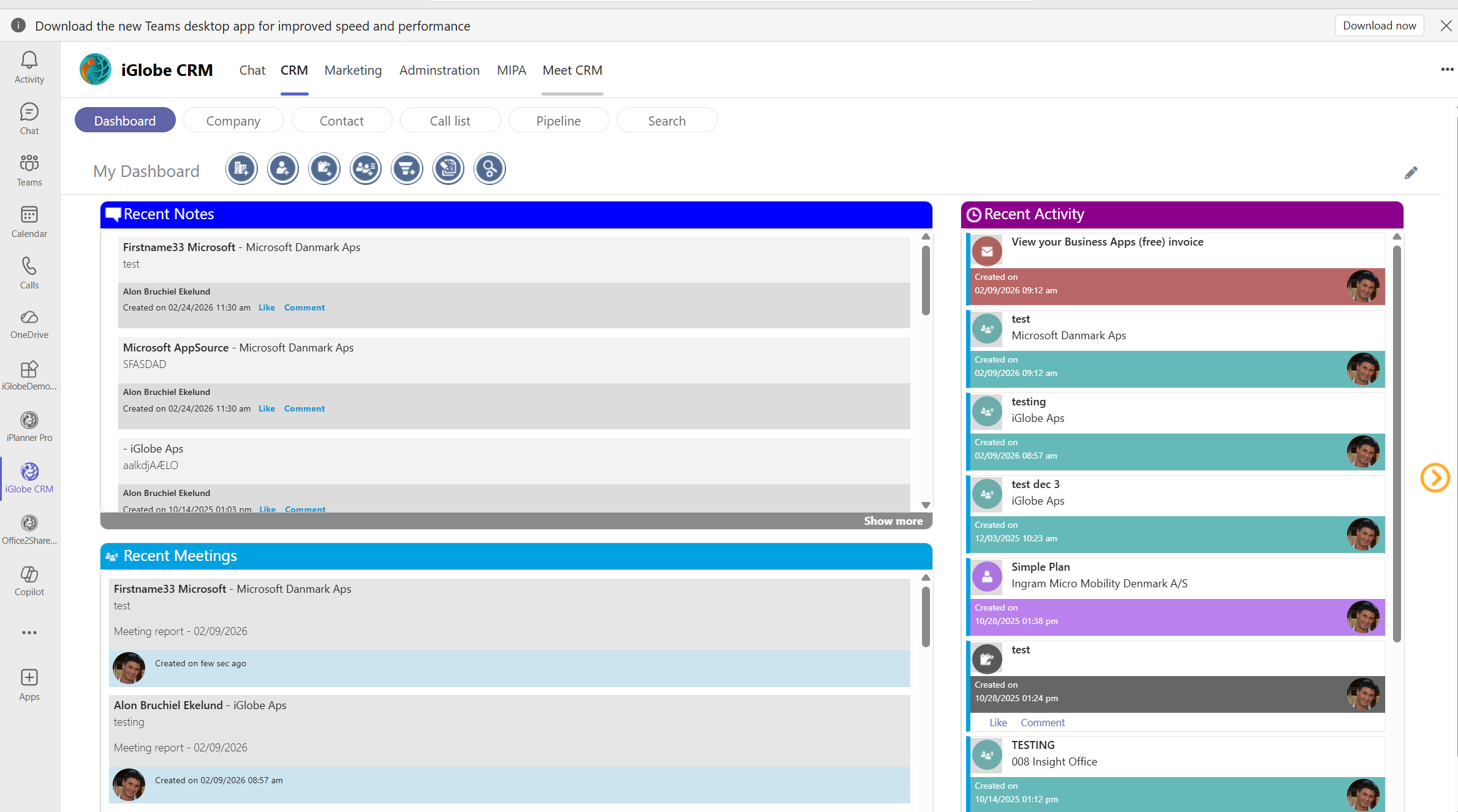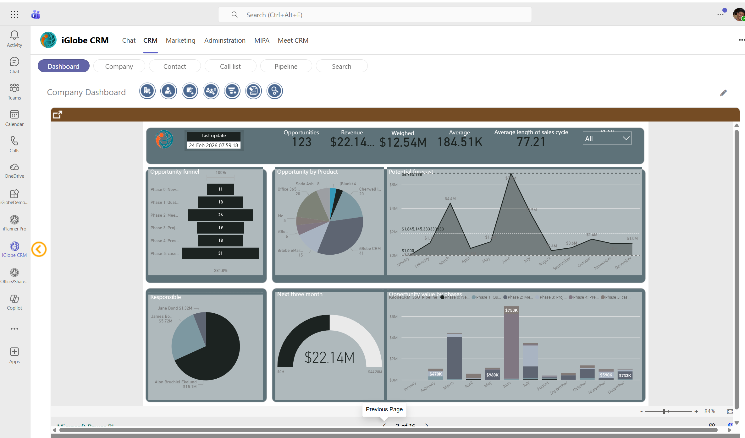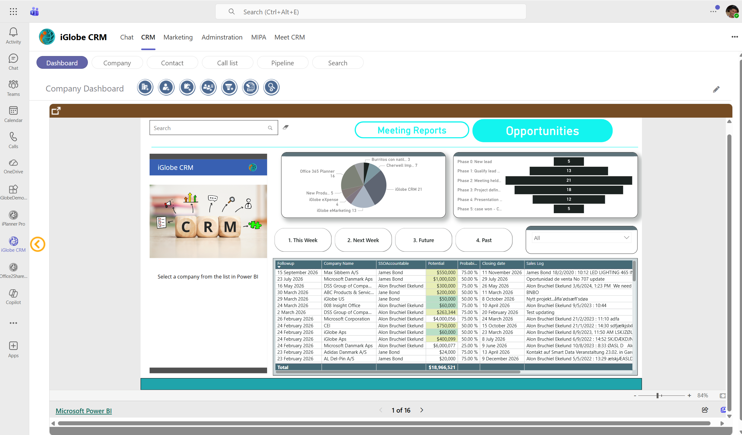provides information on company level. For example, company pipeline, meeting reports, top 10 customers and top contributors to the CRM